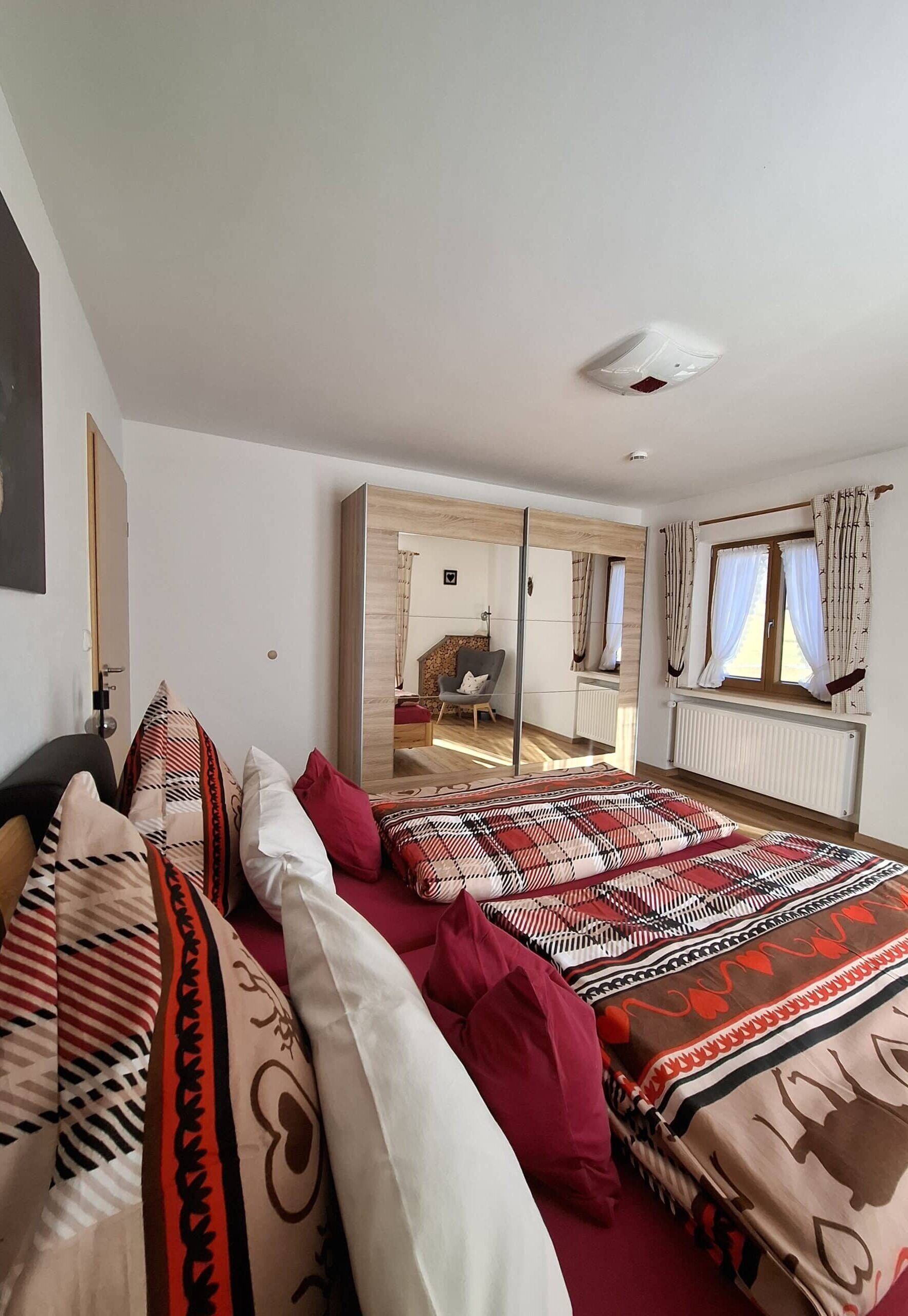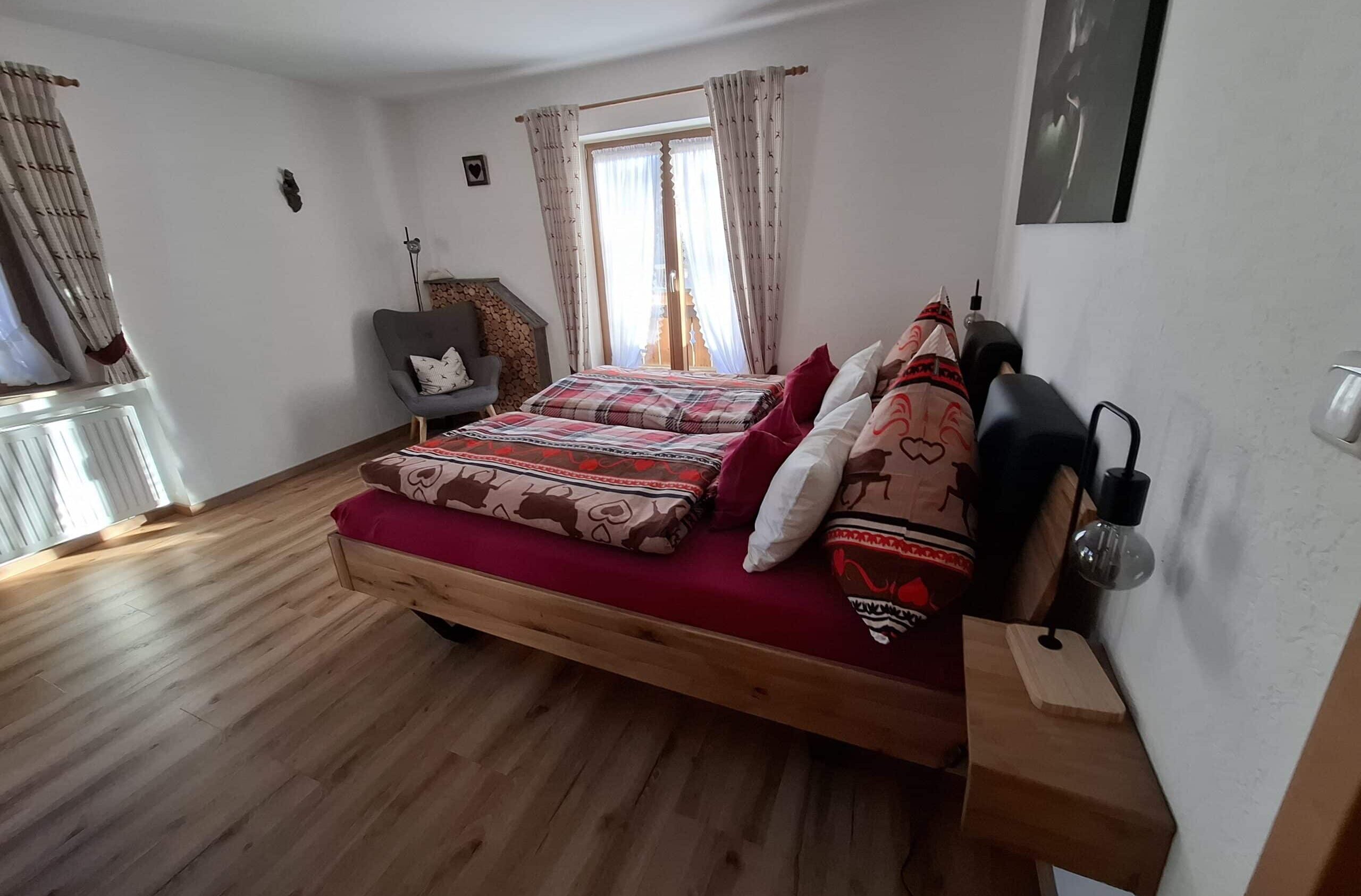 Sie ist ausgestattet mit möbliertem Süd – Westbalkon (Blick auf Karwendel- und Wettersteingebirge mit Zugspitzmassiv), einem separaten Schlafzimmer mit Doppelbett. Einem Wohnzimmer, einer separaten komplett eingerichteten Küche (Toaster, Wasserkocher, Kaffeemaschine, Backofen, Spülmaschine, Kühlschrank, Gefrierfach, SAT-TV, Radio) und Dusche/WC.